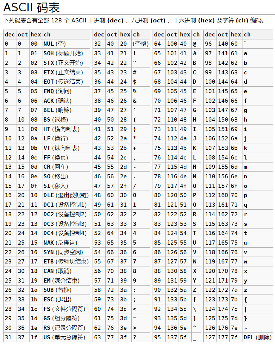 在计算机中,所有的数据在存储和运算时都要使用二进制数表示(因为计算机用高电平和低电平分别表示1和0),例如,像a、b、c、d这样的52个字母(包括大写)以及0、1等数字还有一些常用的符号(例如*、#、@等)在计算机中存储时也要使用二进制数来表示,而具体用哪些二进制数字表示哪个符号,当然每个人都可以约定自己的一套(这就叫编码),而大家如果要想互相通信而不造成混乱,那么大家就必须使用相同的编码规则,后来美国国家标准学会(ANSI)出台了⼀个标准 ASCII 编码,统一规定了上述常用符号用哪些二进制数来表示。