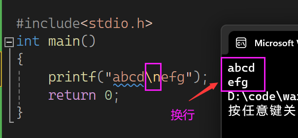 例如:\n就是一个转义字符表示换行的意思,我们可以简单的理解为 \让 n 的意思发生了转变, n 本来是⼀个普通的字符,被 \转义换行的意思。