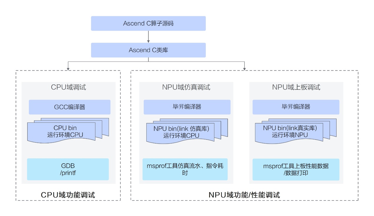 Ascend C提供孪生调试方法,即CPU域模拟NPU域的行为,相同的算子代码可以在CPU域调试精度,NPU域调试性能。孪生调试的整体方案如下:开发者通过调用Ascend C类库编写Ascend C算子kernel侧源码,kernel侧源码通过通用的GCC编译器进行编译,编译生成通用的CPU域的二进制,可以通过gdb通用调试工具等调试手段进行调试;kernel侧源码通过毕昇编译器进行编译,编译生成NPU域的二进制文件,可以通过msprof工具进行性能数据采集等方式进行调试。