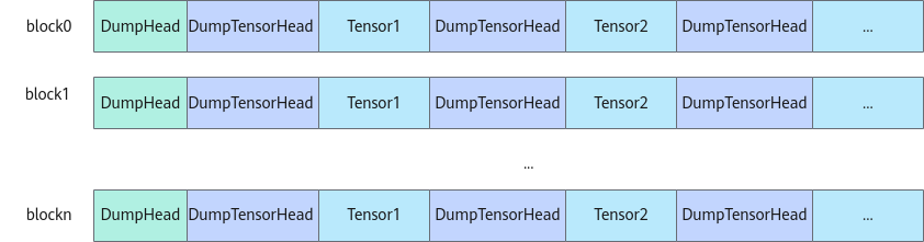 Dump时,每个block核的dump信息前会增加对应信息头DumpHead(32字节大小),用于记录核号和资源使用信息;每次Dump的Tensor数据前也会添加信息头DumpTensorHead(32字节大小),用于记录Tensor的相关信息。如下图所示,展示了多核打印场景下的打印信息结构。