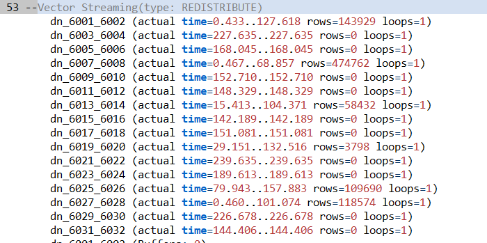 36 | -> Vector Streaming(type: REDISTRIBUTE) | [0.168, 0.217] | 118 | 848 | | [568KB, 568KB] | 2MB | | 78 | 28034.98