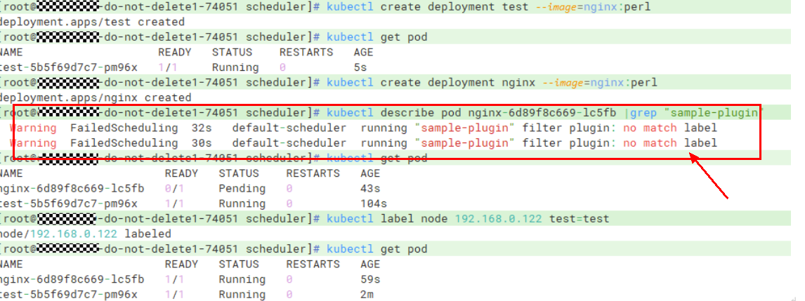 创建nginx工作负载时只能调度至带有test=test标签的节点上,其他工作负载不受影响,调度插件工作