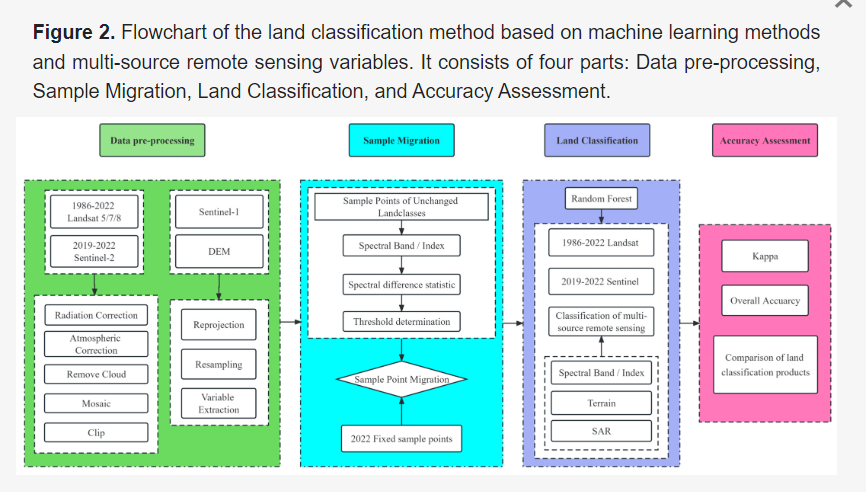 在本研究中,我们在 GEE 中实施了射频分类器,利用 Landsat-8 和 Sentinel-2 数据集对 2022 年植被生长季节的不同空间尺度进行了时间序列土地分类。我们的首要目标是利用多源遥感变量构建的不同土地分类模型,为时间序列数据集建立一个高效、准确和通用的土地分类模型,并根据未发生土地分类变化的样本点图像值差异,确定土地分类样本点和迁移阈值。我们的目标是 (1) 确定基于土地分类无变化的样点迁移阈值;(2) 根据阈值分析使用陆地卫星遥感图像和高精度哨兵图像的 36 年时间序列制作的土地分类模型的准确性;(3) 确定基于多源遥感变量不同组合的最佳射频土地分类模型,并比较图像分辨率对分类准确性的影响。