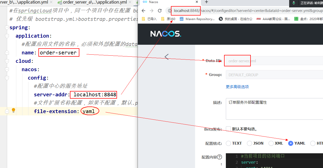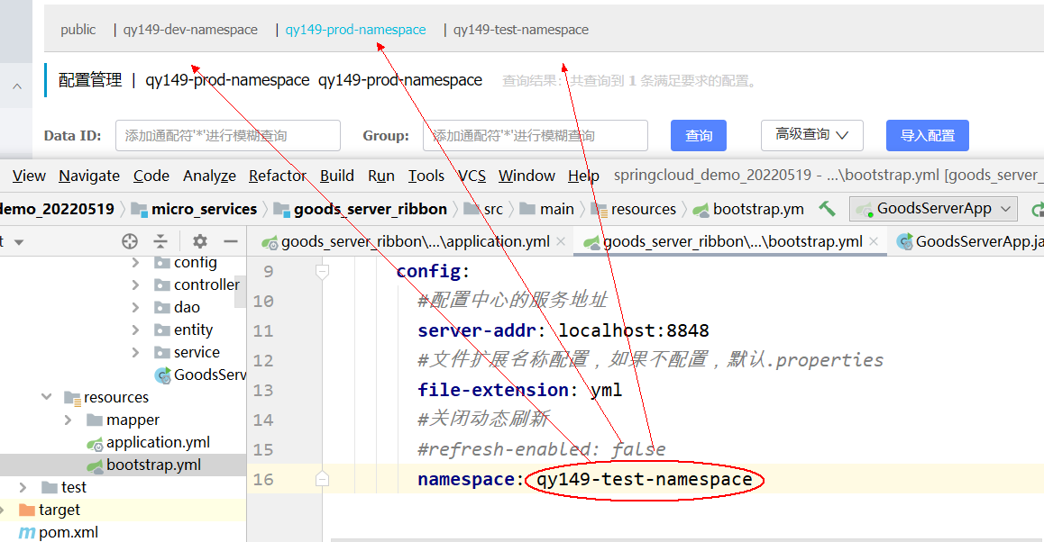 该配置必须放在 bootstrap.properties 文件中。此外 spring.cloud.nacos.config.namespace 的值是 namespace 对应的 id,id 值可以在 Nacos 的控制台获取。并且在添加配置时注意不要选择其他的 namespae,否则将会导致读取不到正确的配置。