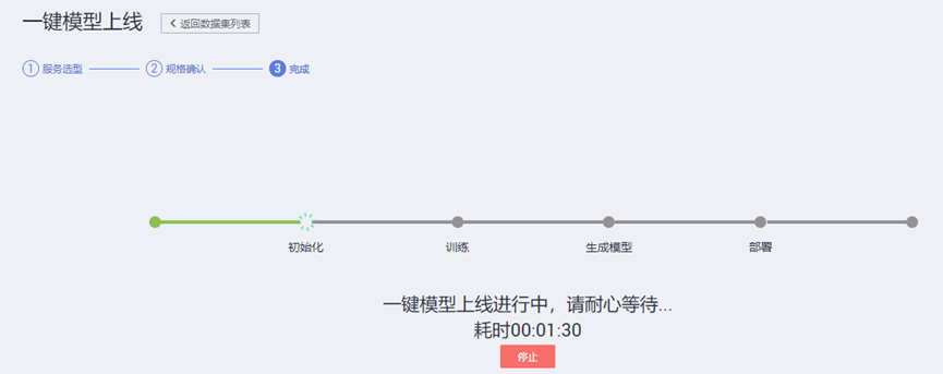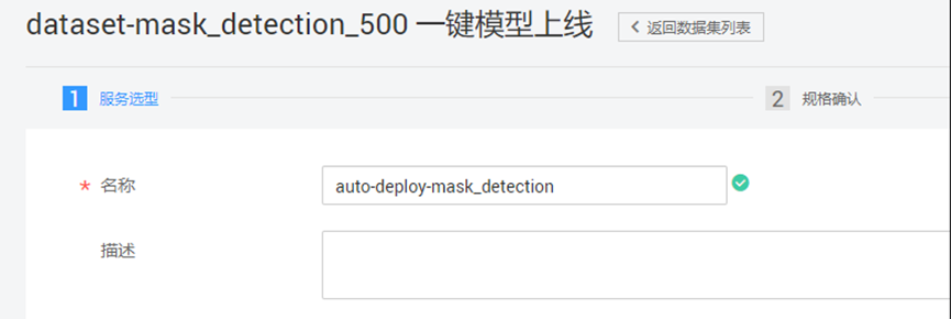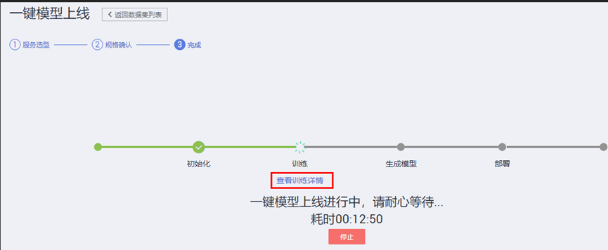 数据集发布成功后,可以使用一键模型上线功能,训练模型,并将模型部署成在线API服务。