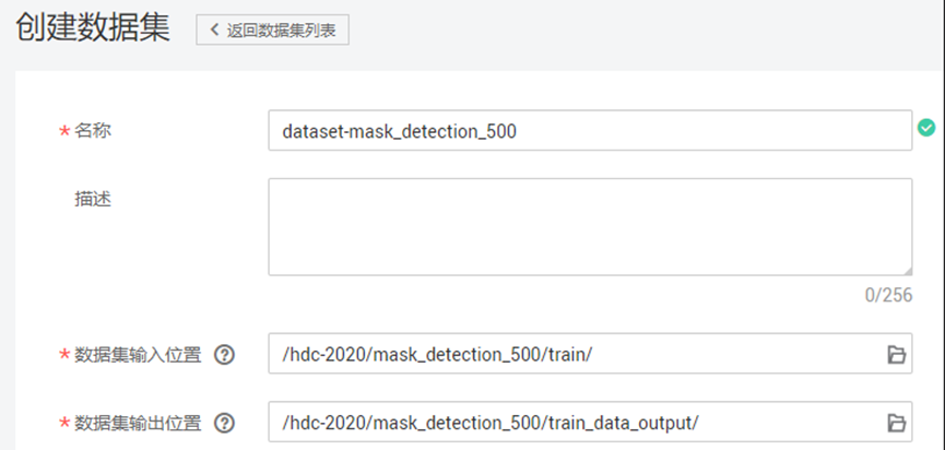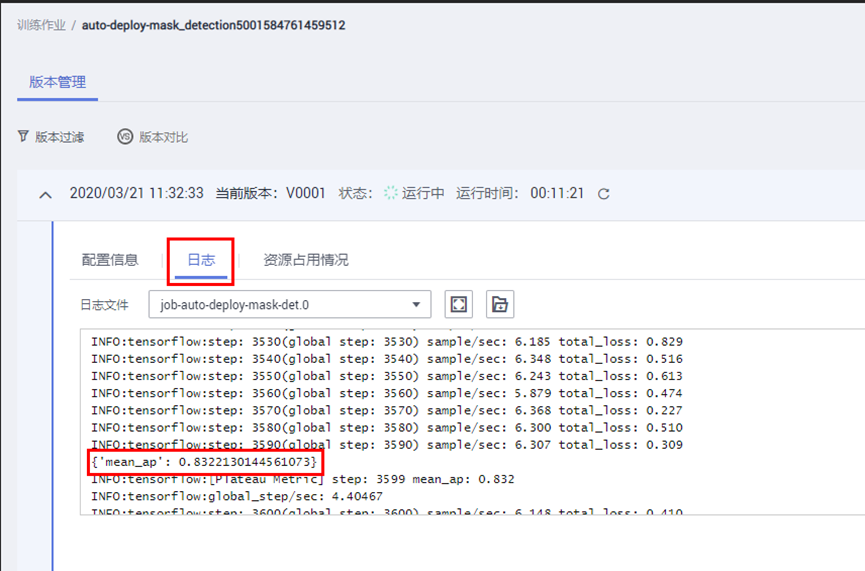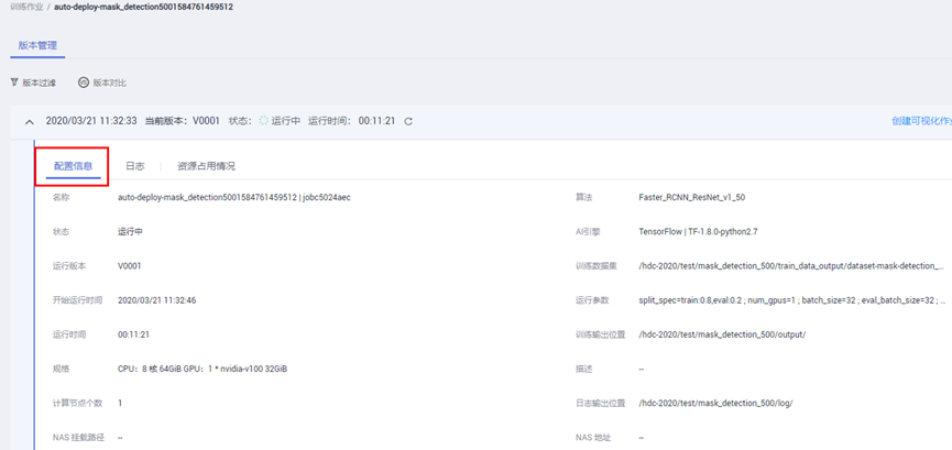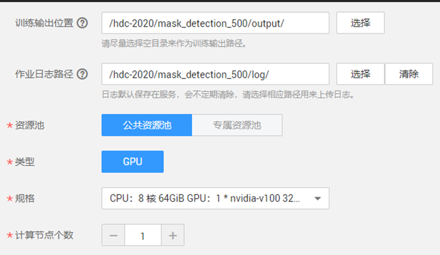 作业日志路径:选择OBS路径/hdc-2020/mask_detection_500/log/(log文件夹需要自己创建,创建方式同训练输出位置),用于保存训练日志文件。