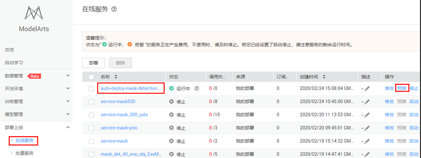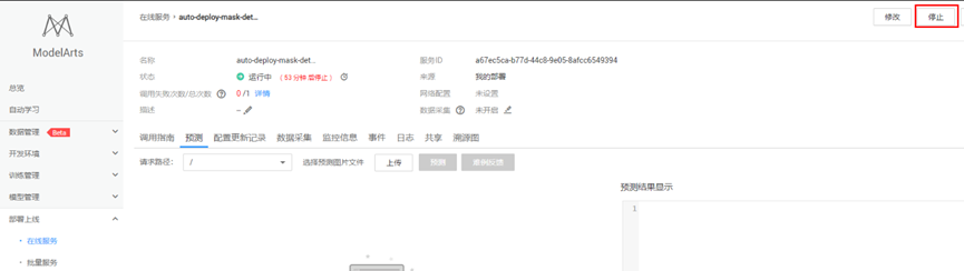为了避免持续扣费,案例完成后,需要关闭在线服务,点击“停止”按钮即可: