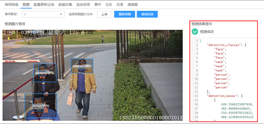 如果用户想要将该口罩识别API集成到自己的系统或者应用中,可以通过HTTP请求调用此API,获取person、face和mask检测框。判断一个人是否戴口罩的方法是,判断face检测框里面是否有mask检测框。