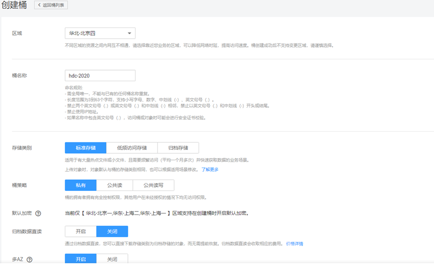 登录OBS管理控制台, 页面右上角单击"创建桶",系统弹出如下图所示的对话框,选择"区域"为"华北-北京四",输入自定义的桶名称,其他选项保持默认即可,最后点击页面下方"立即创建"按钮即可成功创建。