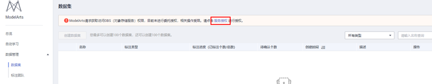 为了授权ModelArts访问OBS,需要进入ModelArts数据集,点击“服务授权”按钮,进行授权。https://console.huaweicloud.cn/modelarts/?region=cn-north-4#/dataset
