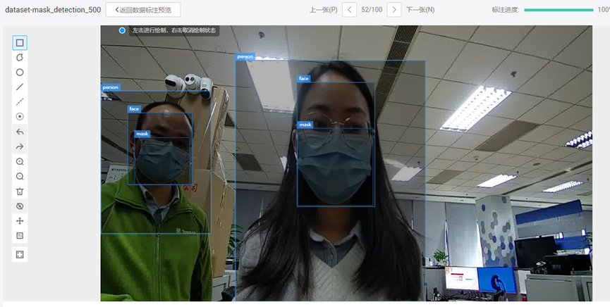 数据集共有三种类型的标注框,person(包含头部和肩部)、face和mask。判断一个人有没有戴口罩的方法是,脸部的检测框里面是否有口罩的检测框。person物体的作用是对人做目标跟踪。