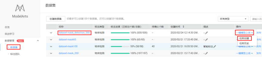 点击此链接,进入ModelArts数据集。请确保区域在“华北-北京四”,本案例所有操作在“华北-北京四”。