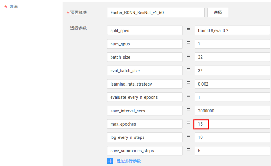 运行参数:Faster_RCNN_ResNet_v1_50自带默认运行参数。将max_epoches改为15,其他运行参数保持默认。这些运行参数会控制的模型训练过程,有经验的用户可以调节这些运行参数。