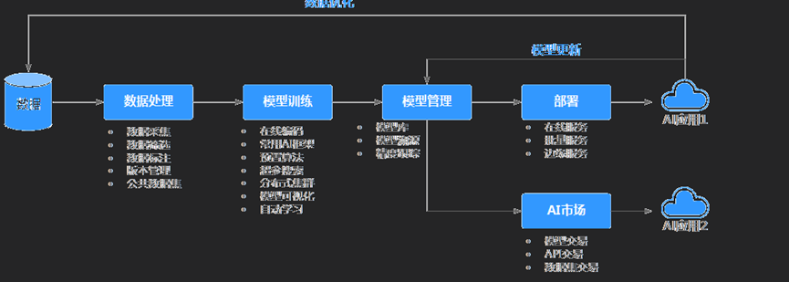 "一站式"是指AI开发的各个环节,包括数据处理、算法开发、模型训练、部署都可以在ModelArts上完成。ModelArts底层支持各种异构计算资源,开发者可以根据需要灵活选择使用,而不需要关心底层的技术。