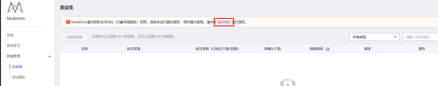 为了授权ModelArts访问OBS,需要进入ModelArts数据集,点击“服务授权”按钮,进行授权。https://console.huaweicloud.cn/modelarts/?region=cn-north-4#/dataset