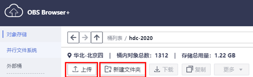 点击OBS Browser+界面上的“上传”按钮,即可上传文件夹或者文件;点击“新建文件夹”按钮,即可创建文件夹。