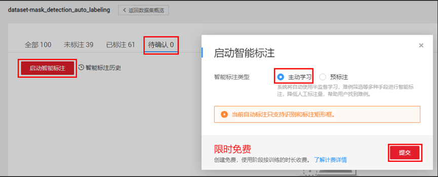 点击进入“待确认”页签,然后点击“启动智能标注”按钮,选择“主动学习”,最后点击“提交”按钮,启动智能标注作业。“提交”按钮的位置如下图所示: