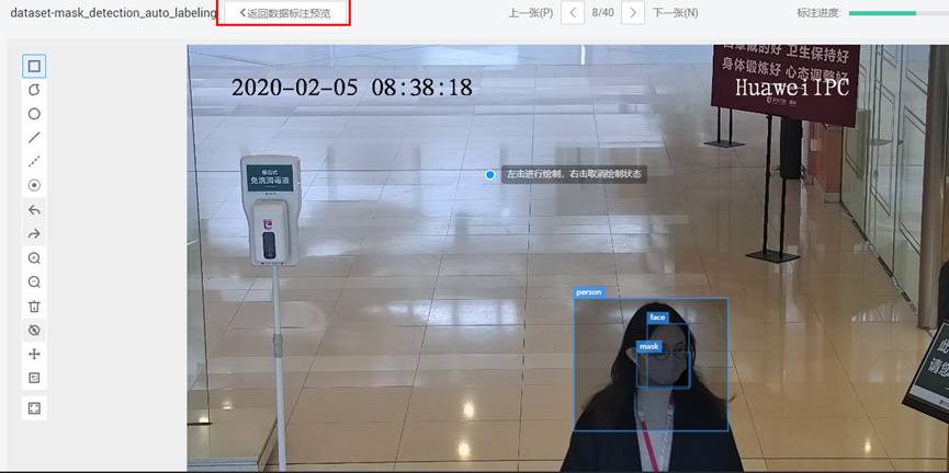 点击“返回数据标注预览”按钮,返回到数据集标注页面。“返回数据标注预览”按钮的位置如下图所示: