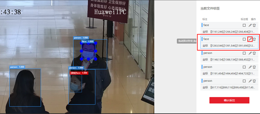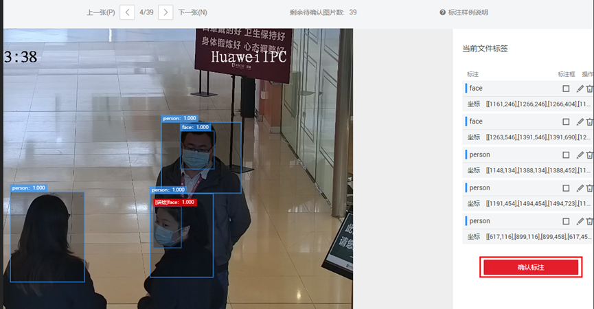 修正完标注信息后,就点击“确认标注”按钮,系统会将这张图片及其标注信息加入到已标注数据中。“确认标注”按钮如下所示: