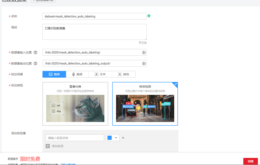 点击页面上的“创建数据集”按钮, 创建数据集页面填写示例如下: