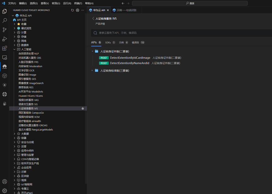 在IntelliJ IDEA等系列平台和VS Code IDE,华为云API插件的名称是Huawei Cloud API。而在CodeArts IDE,API插件是IDE原生内置的,名称是华为云API开发套件。