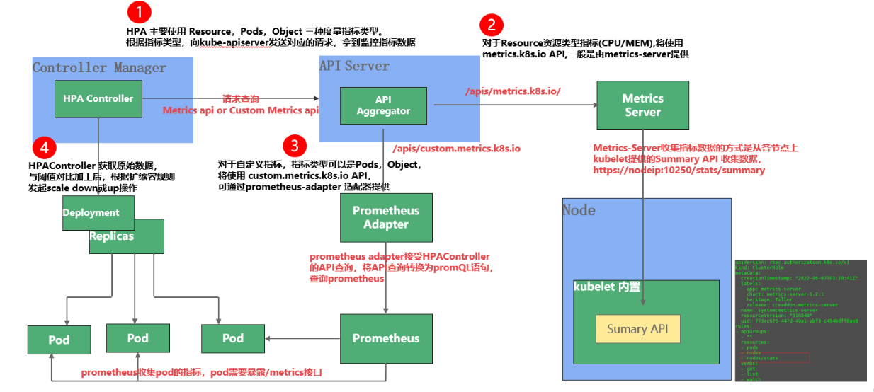 - Core metrics(核心指标):Metrics server通过调用各个节点kubelet 10250端口,由kubelet内部cAdvisor模块获取度量指标,对应指标实现由kubelet提供,使用者无法修改,然后返回给HPA。