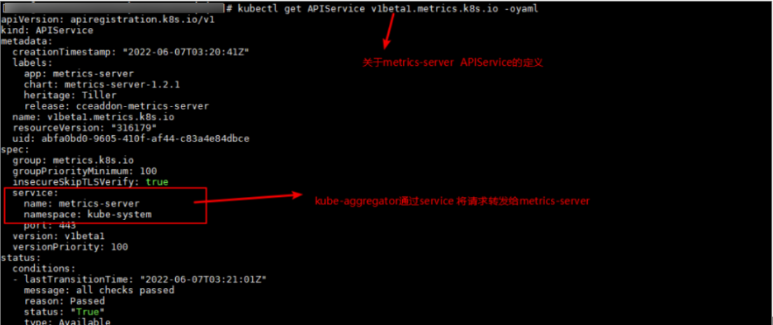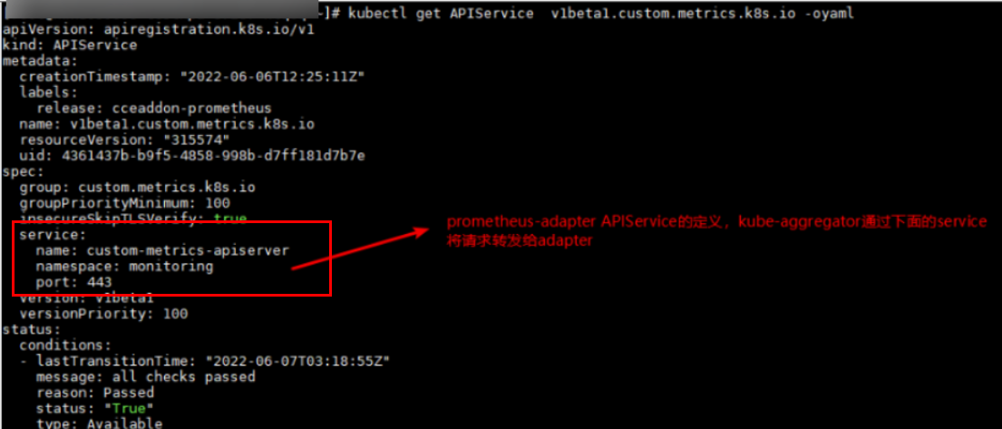 如下图示例,通过APIService资源新增 /apis/metrics.k8s.io/v1beta1 和 /apis/custom.metrics.k8s.io/v1beta1。当kube-apiserver收到对应URL请求后,会将请求转发给APIService资源中spec.service指定的服务,URL为 /apis/metrics.k8s.io/v1beta1的请求转发给metrics-server服务处理,URL为/apis/custom.metrics.k8s.io/v1beta1的请求转发给custom-metrics-apiserver服务(本质上就是Prometheus-adapter,服务名称为custom-metrics-apiserver而已)。如此,便可以通过直接访问kube-apiserver端口,获取对应的指标数据。