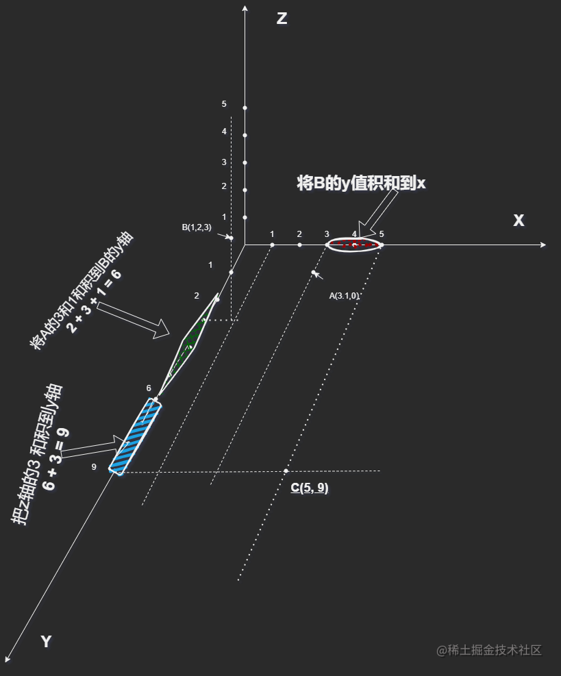 那么 x 轴为 A点的 x 值(3) 加 B 点的 z轴值(3) + B 点的 y轴值(2) 和 x轴值(1)
