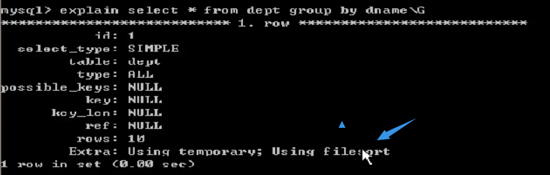 Using temporary说明使用了临时表,一般看到它说明查询需要优化了,就算避免不了临时表的使用也要尽量避免硬盘临时表的使用。
