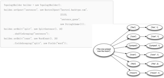 首先,当创建了新的元组树边的时候,要通知storm。其次,当完成了一个元组的处理之后要告诉storm。通过这种方式,storm就可以知道元组被完全处理了,然后调用ack方法,或者调用fail方法,如果处理失败。