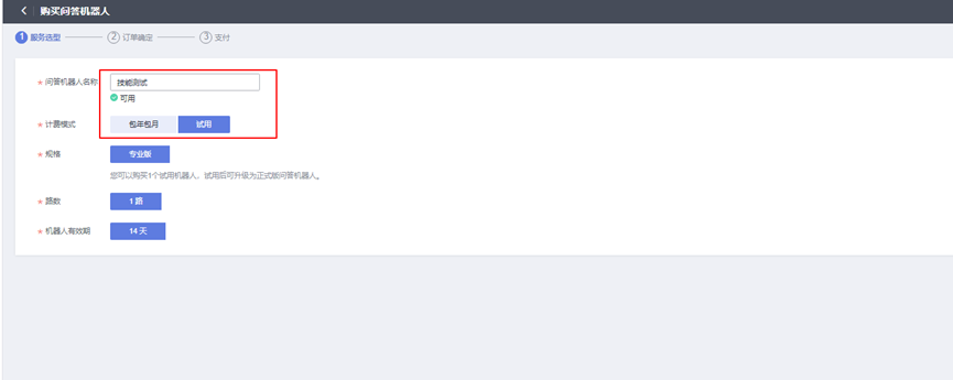 分别输入问答机器人名称,选择试用的计费模式,并点击立即购买完成支付,即完成试用专业版机器人创建。