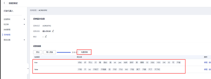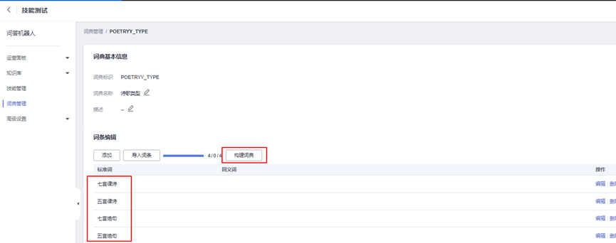 点击进入此页面,参看上述创建诗歌类型词典的方式,创建藏头诗词典。点击“创建词典”按钮,并进入“编辑”页面。填写内容如下:https://console.huaweicloud.cn/cbs/?region=cn-north-4#/home/qa-robot