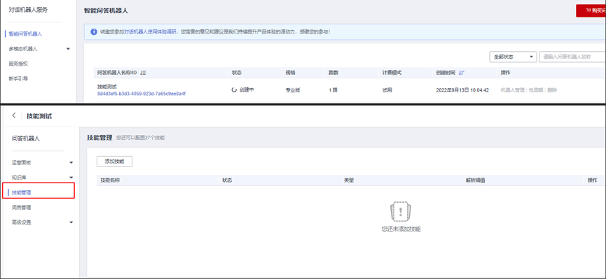 问答机器人创建成功后,返回对话机器人服务主页面,等待机器人创建成功后,点击“机器人名称”进入机器人,左侧的标签栏中会有一项技能管理。