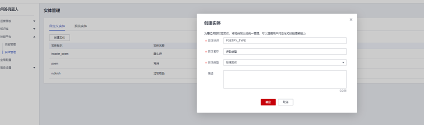 添加诗歌类型实体,创建实体,点击此链接,进入对话机器人服务,点击进入相应的机器人,点击“实体管理”,再点击“创建实体”按钮,按照下图指导添加诗歌类型实体:https://console.huaweicloud.cn/cbs/?region=cn-north-4#/home/qa-robot
