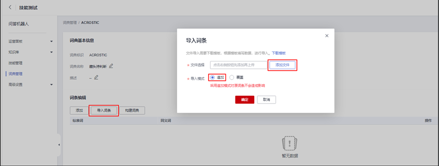 进入“编辑”界面后,点击“导入词条”按钮,点击“添加文件”按钮,选择本地文件夹中的acrostic_dict.txt文件,导入模式选择“追加”,最后点“确定”按钮,完成藏头诗判断词典词条导入,如下图所示:
