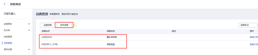 至此,两条词典创建成功,返回词典管理页面,点击“发布词典”,如下图所示: