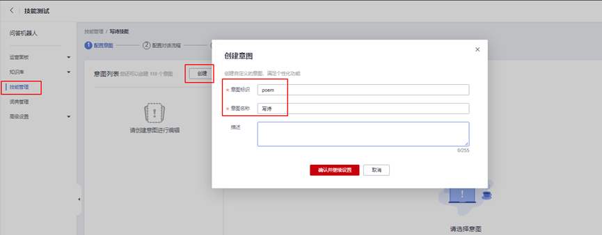点击此链接,进入对话机器人服务的“技能管理”,新建写诗技能并进行技能配置。