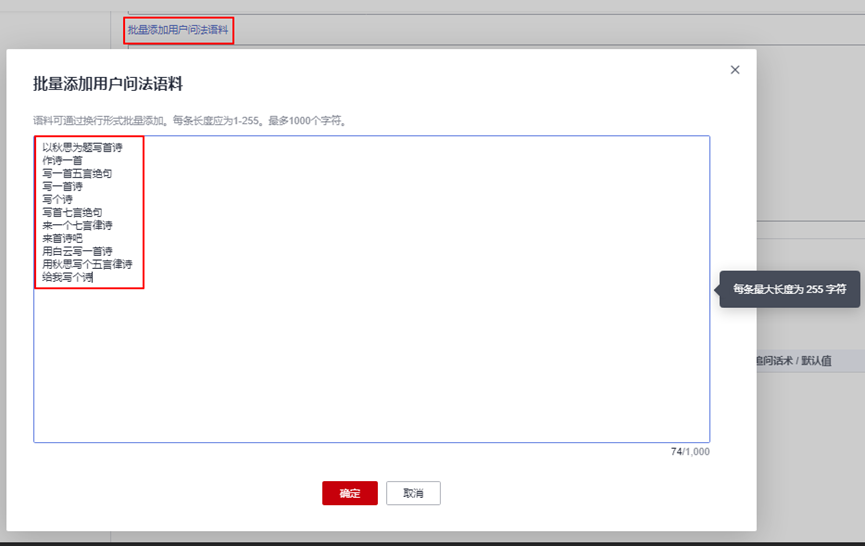 进入“poem”意图的“用户问法”,点击“用户问法语料”输入框下方的蓝色字体“批量添加用户问法语料”,复制下方的语料至弹出对话框,点击“确认”完成用户问法预料导入。