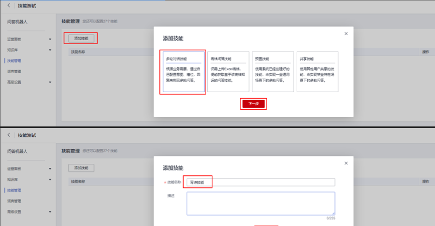 点击“添加技能”按钮,选择“多轮对话技能”,点击下一步,输入技能名称:写诗技能,如下图所示: