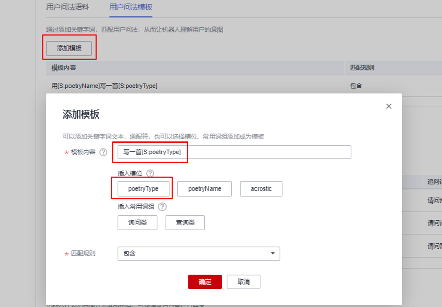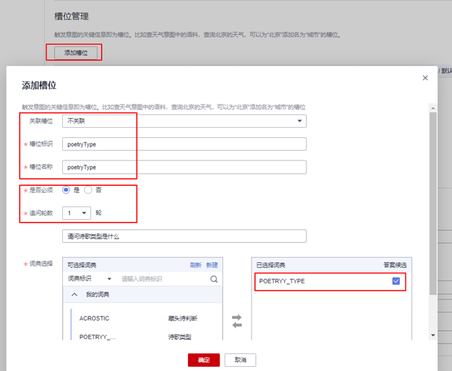 然后点击“添加槽位”按钮,按照如下指导,添加poetryType槽位: