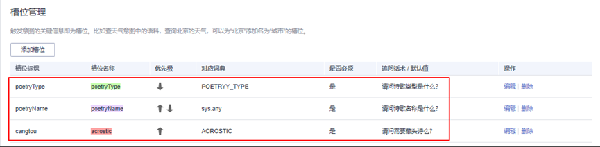 往下滑动页面,找到“槽位管理”页面,分别创建槽位:poetryType(诗歌类型),poetryName(诗歌名称),acrostic(藏头诗)三个槽位。槽位是触发意图的关键信息。