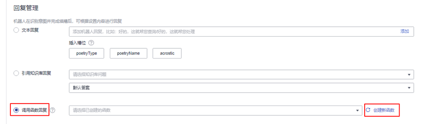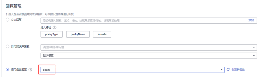 返回poem意图管理页面,选择调用函数回复,在下拉框中选择已创建的函数poem,如下图所示: