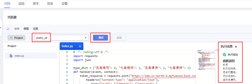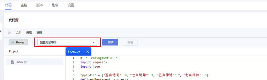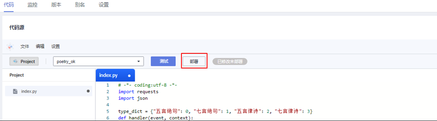 代码上传方式:在线编辑。将本地文件夹下poetry_demo.py文件中的代码复制粘贴进来。然后填入真实的账号名、用户名、密码。再点击“部署”。