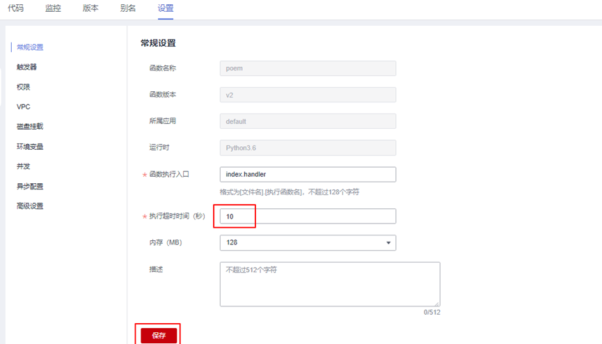 配置函数的超时时间,点击“设置”页签,然后将执行超时时间改为10,点击保存,如下图所示: