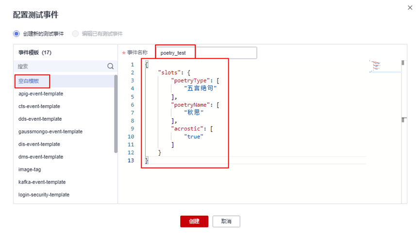 在测试事件输入框中填入:{"slots":{"poetryType":["五言绝句"],"poetryName":["秋思"],"acrostic":["true"]}},如下图所示: