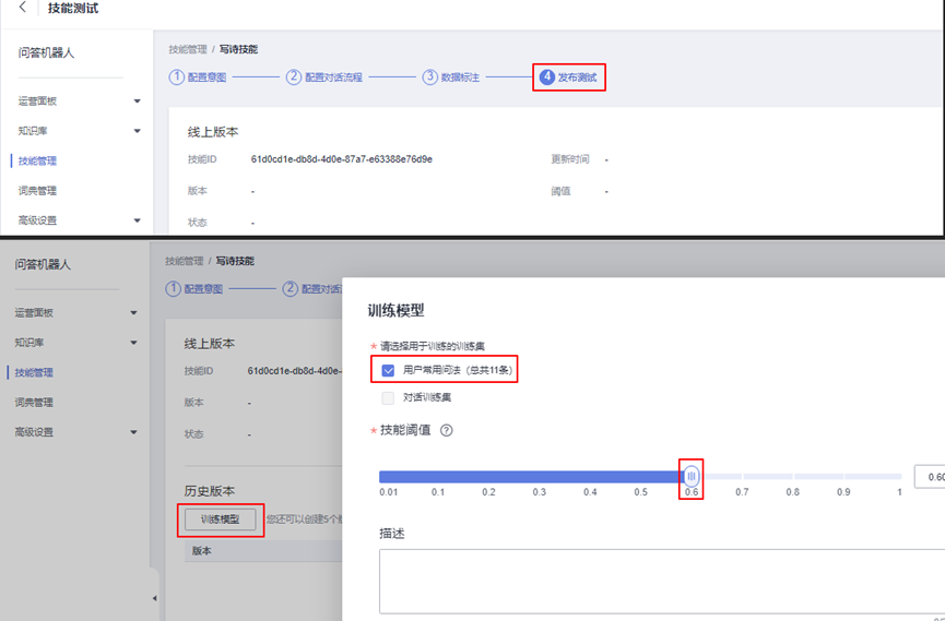 在“写诗技能”页面中,进入“发布测试”页面,点击“训练模型”按钮,勾选“用户常用问法”,技能阈值默认即可。点击“确定”开始模型训练,训练时长大概3分钟。