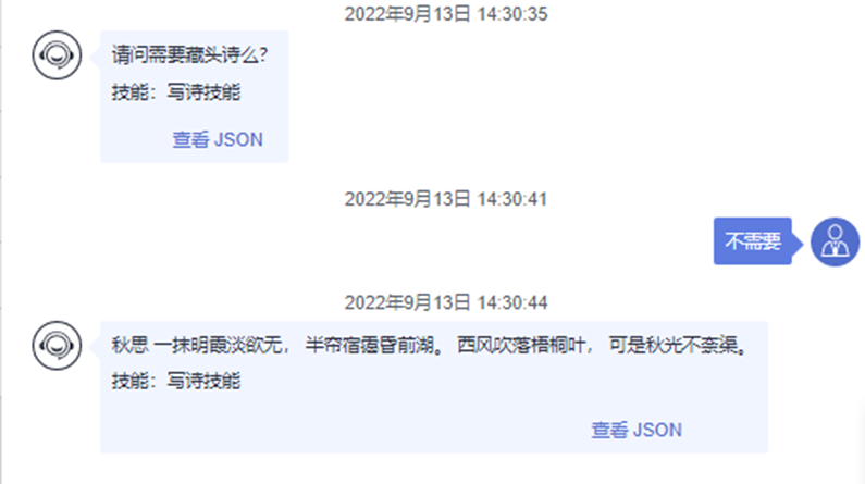 模型发布完成后,回到“技能管理”页面,点击右上角“对话体验”按钮(诗歌类型槽位已配置开启候选项,因此用户可通过点击响应类型进行自动回复)