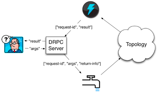 DRPCSpout发射[args, return-info]。return-info是DRPC服务器的主机名和端口号,以及DRPC服务器生成的id。