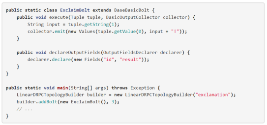 我们来看一个简单的例子。 这是DRPC拓扑的实现,它返回带有“!”的输入参数。附: