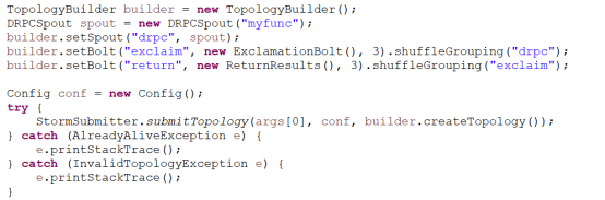 需要手动设定好开始的DRPCSpout以及结束的ReturnResults